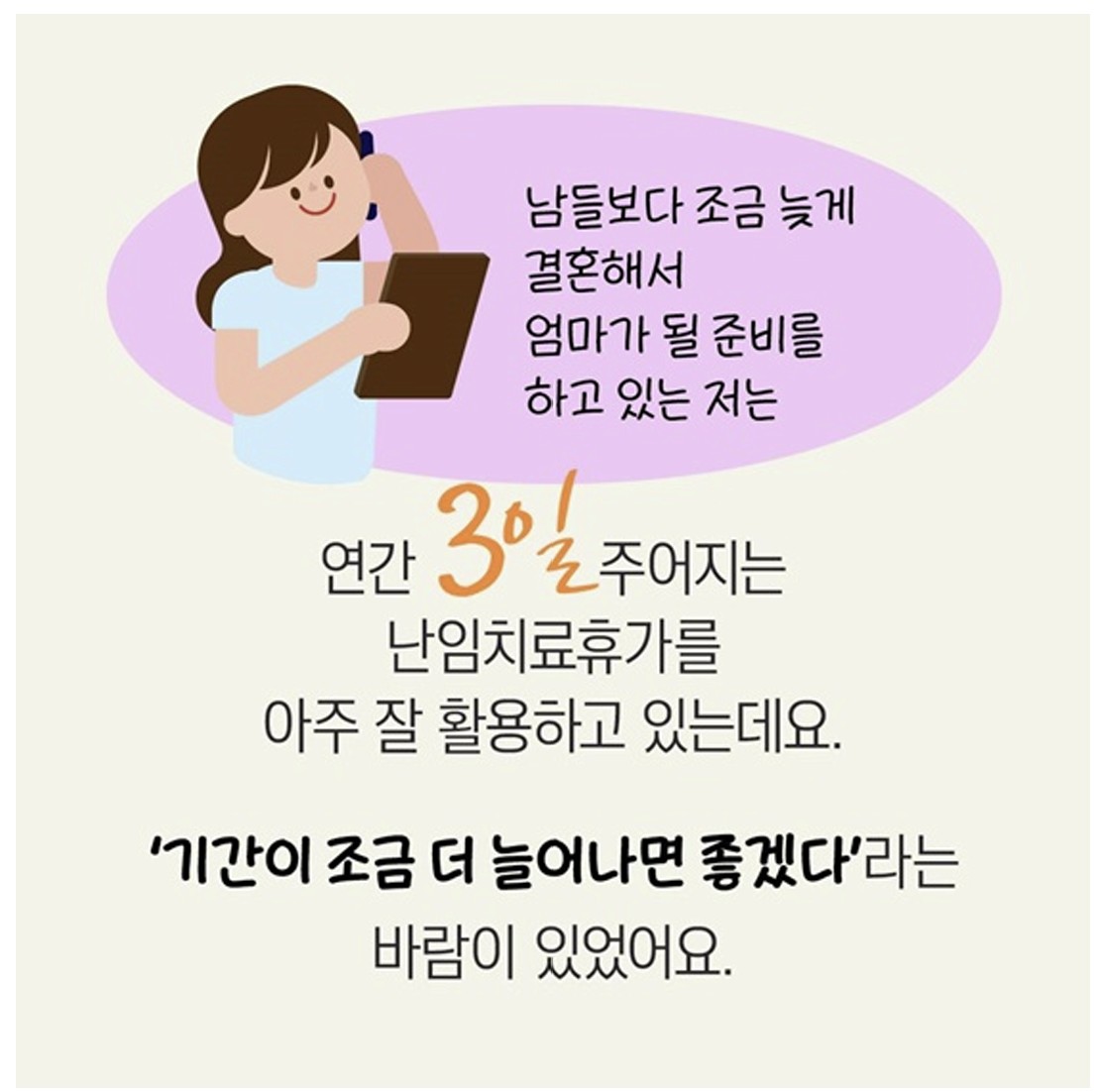현재 난임 치료를 위한 휴가는 최대 3일(유급 1일, 무급 2일)까지만 사용할 수 있습니다. 하지만 2025년부터는 총 6일(유급 3일, 무급 3일)로 확대됩니다.